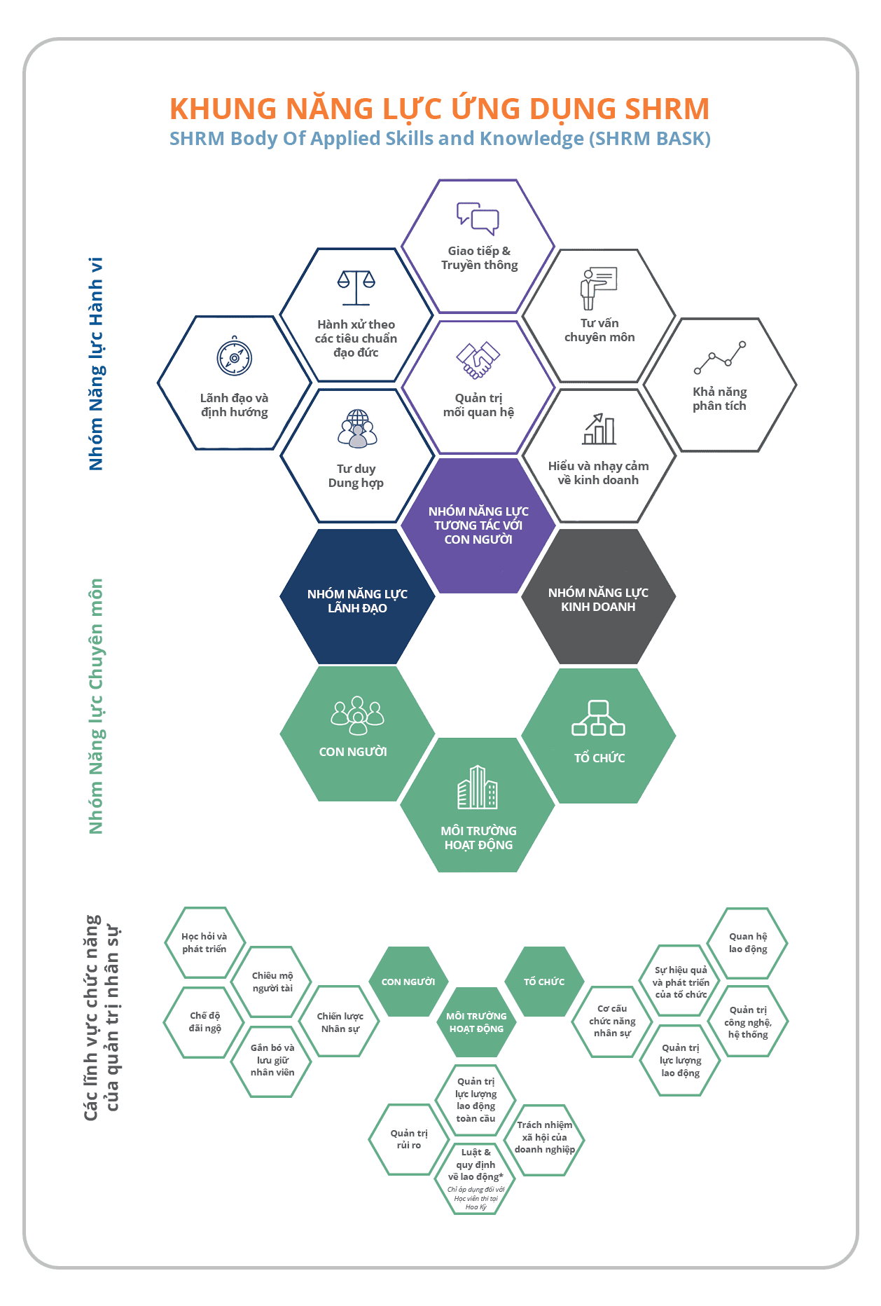 Nội dung của chương trình đào tạo “Quản trị Nhân sự Quốc tế / International Human Resource Management” (IHRM) được thiết kế dựa theo Mô hình năng lực SHRM (SHRM Competency Model®) và Khung năng lực Ứng dụng SHRM (SHRM BASK®) nhằm giúp giới nhân sự tại Việt Nam tìm hiểu và tiếp cận được với kiến thức và năng lực nhân sự theo chuẩn mực toàn cầu.