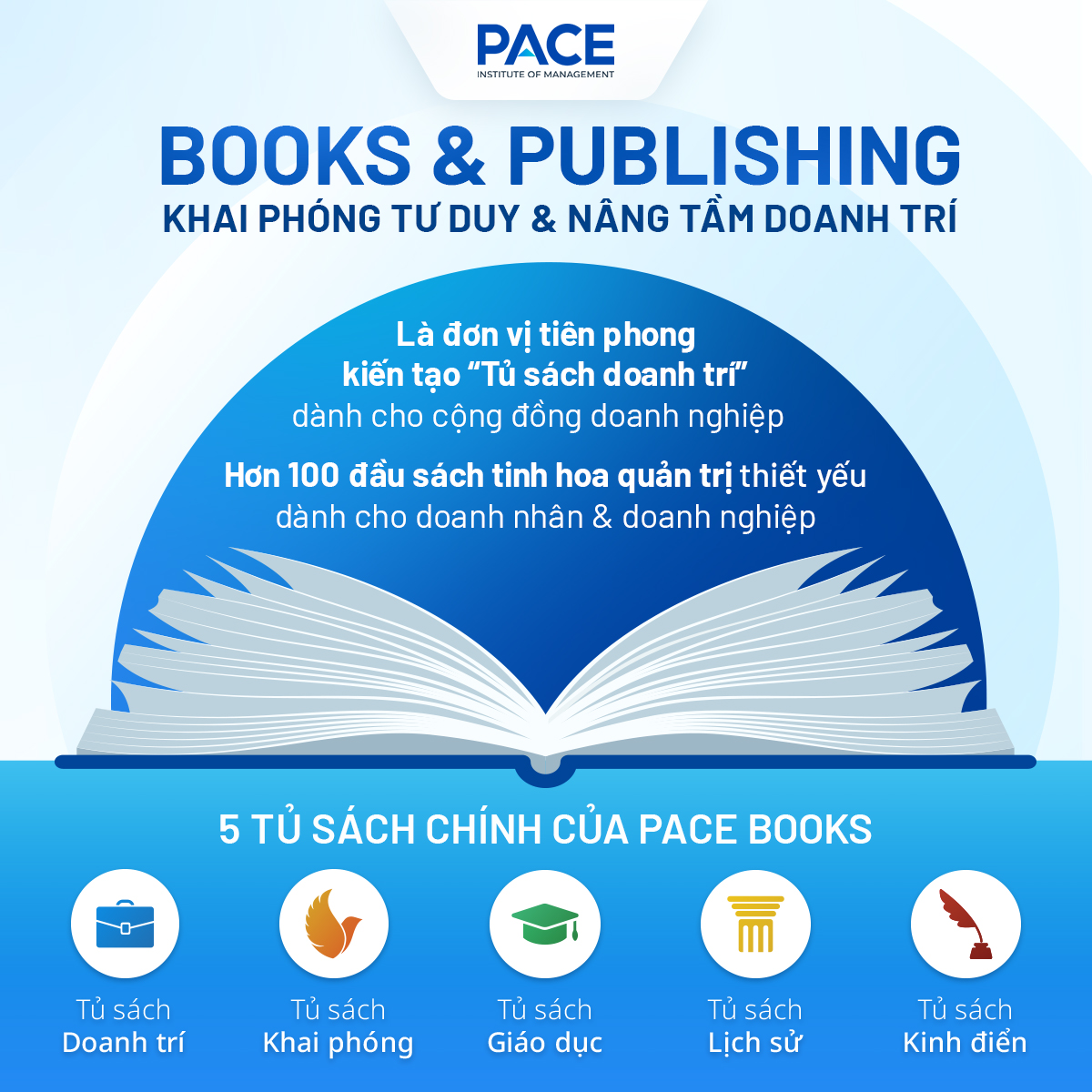 Với sứ mệnh đó, PACE Books là đơn vị tiên phong trong việc kiến tạo “Tủ sách Doanh trí” dành cho cộng đồng doanh nghiệp Việt Nam - tập hợp hơn 100 đầu sách tinh hoa quản trị bao quát từ lãnh đạo, nhân sự, marketing, tài chính đến quản trị dự án,... giúp doanh nghiệp tiếp cận nguồn tri thức toàn diện cho mọi cấp độ từ quản lý đến đội ngũ.