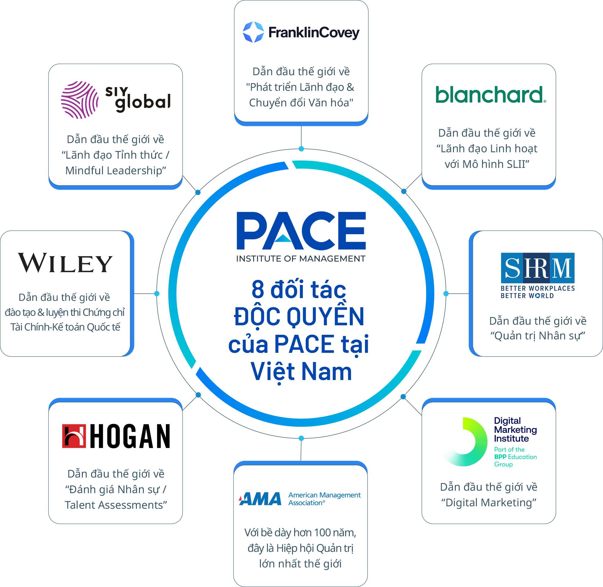 • 8 Đối tác toàn cầu: hợp tác chiến lược với các tổ chức hàng đầu thế giới như FranklinCovey, Blanchard, SHRM, SIY Global, DMI, Hogan, AMA và Wiley.