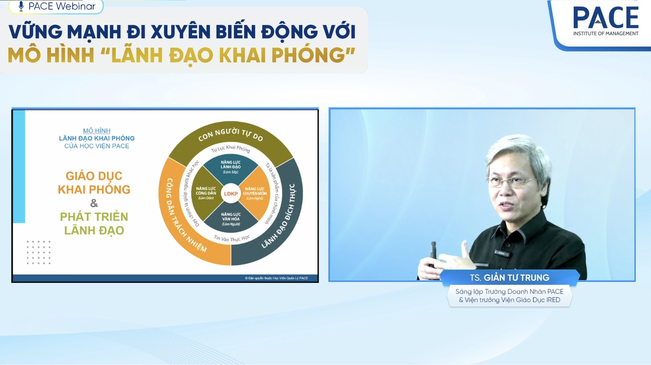 Sáng ngày 13/05/2025, Học viện Quản lý PACE đã tổ chức buổi PACE Webinar cùng TS. Giản Tư Trung với sự tham dự của gần 1.000 nhà lãnh đạo, quản lý các cấp, và doanh nhân trên toàn quốc. Đây là hoạt động thuộc chuỗi PACE Webinar - Một hoạt động cộng đồng của PACE nhằm đồng hành cùng cộng đồng doanh nghiệp đi xuyên biến động.